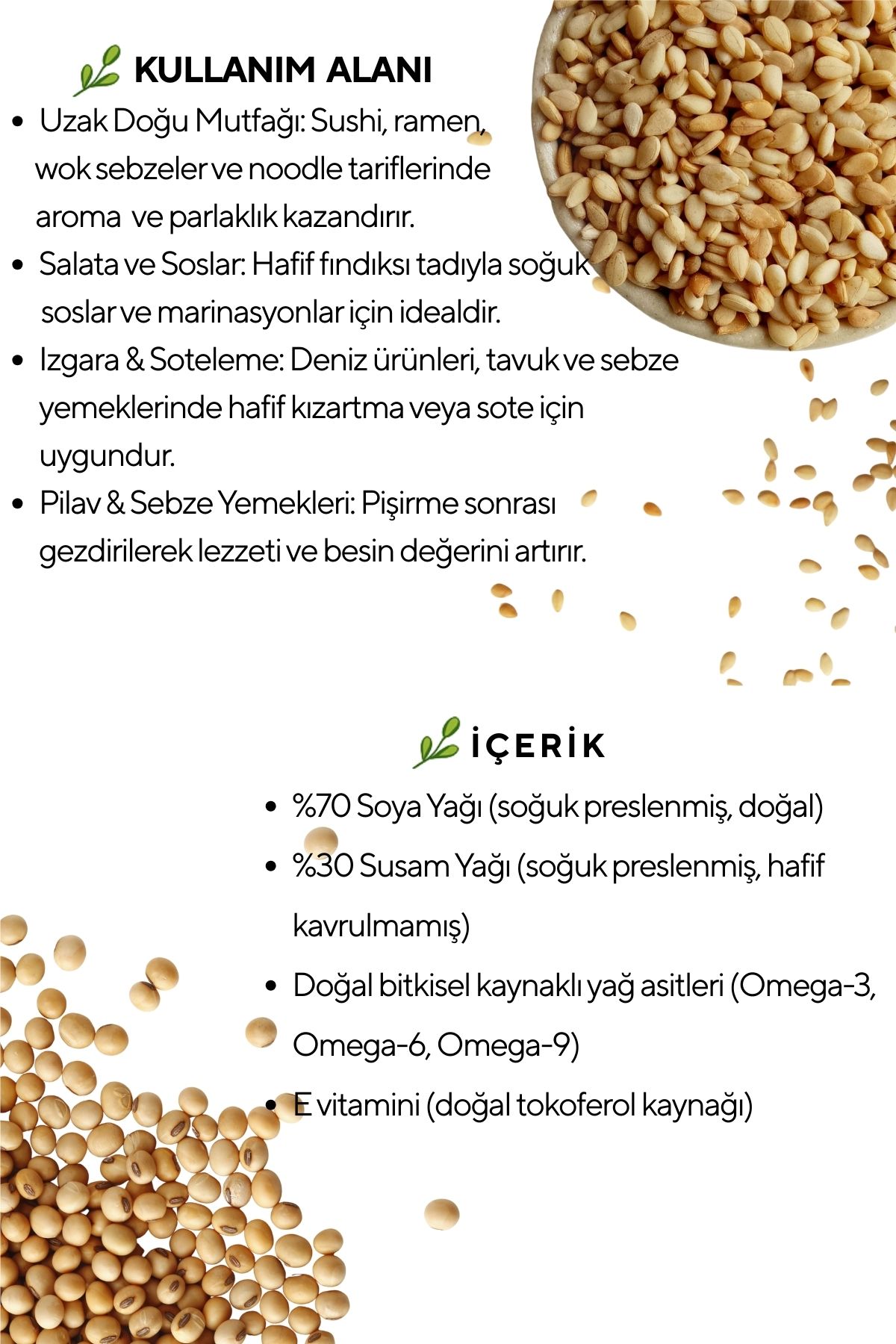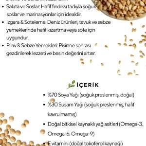 Hem Asya mutfağına özgü tariflerde hem de modern vegan & bitkisel tariflerde rahatlıkla kullanılabilir. Omega 6, E vitamini, bitkisel proteinve doymamış yağ asitleri bakımından zengin içeriğiyle sağlıklı mutfaklara katkı sağlar. Ürün, 250 ml’lik ışığı filtreleyen cam şişe ile sunulur.